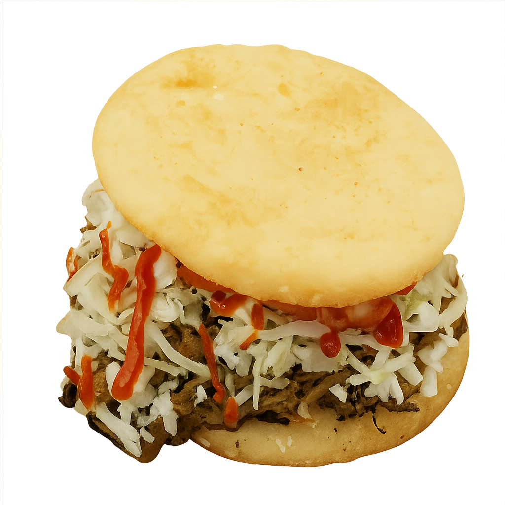 2 arepas de maíz rellenas con pernil, pollo, carne mechada o lomito, más queso frito, repollo fresco y salsa tártara con ketchup.
